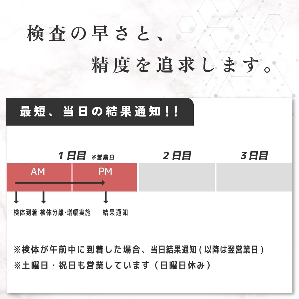 【内容|補足】 採取容器・検査キットご利用方法・検査申込書・返送用封筒|匿名性の高いパッケージでお届け。申し込みも匿名でOKです。研究用試薬を用いた検査であり診断には使えませんのでご注意ください。