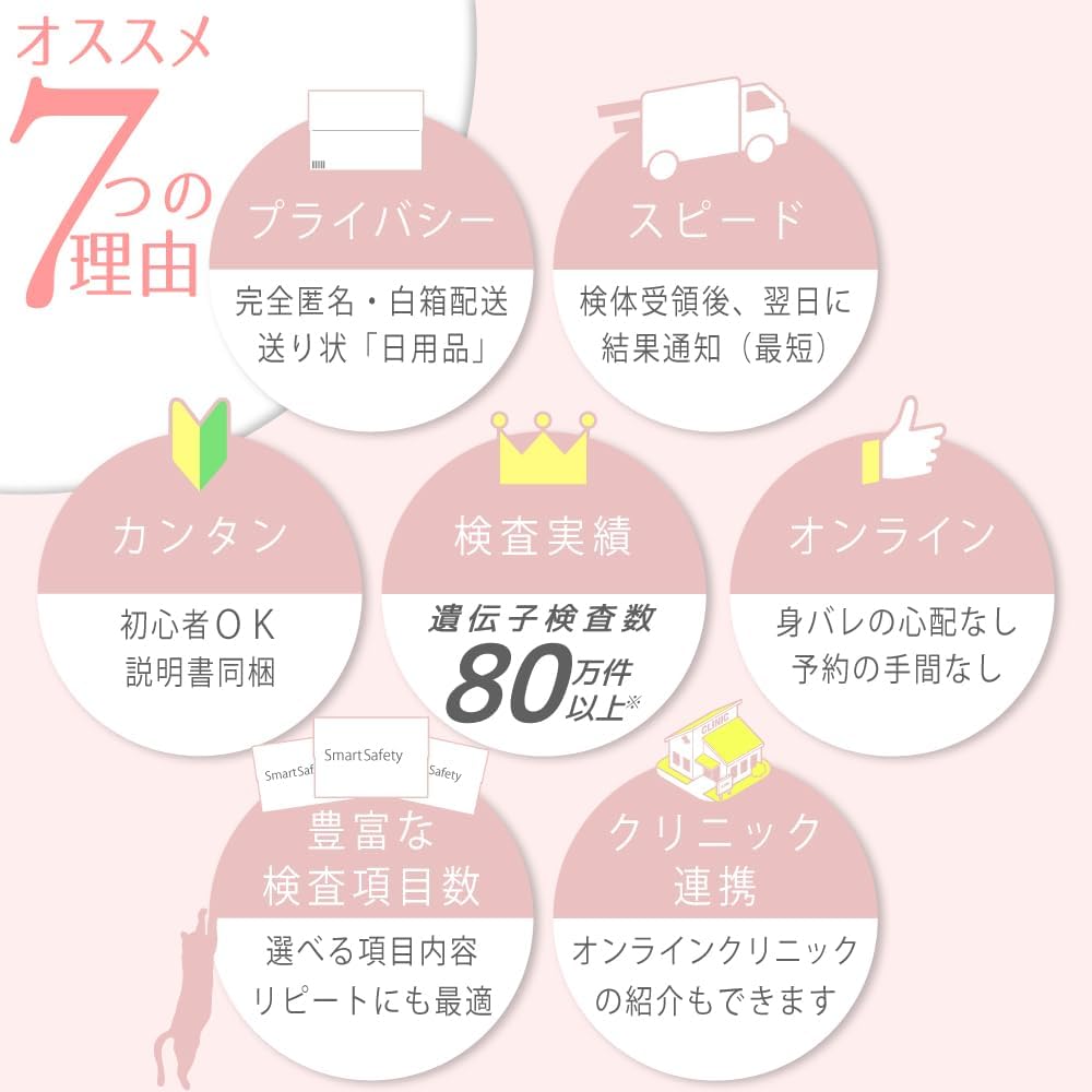 【内容|補足】 採取容器・検査キットご利用方法・検査申込書・返送用封筒|匿名性の高いパッケージでお届け。申し込みも匿名でOKです。研究用試薬を用いた検査であり診断には使えませんのでご注意ください。