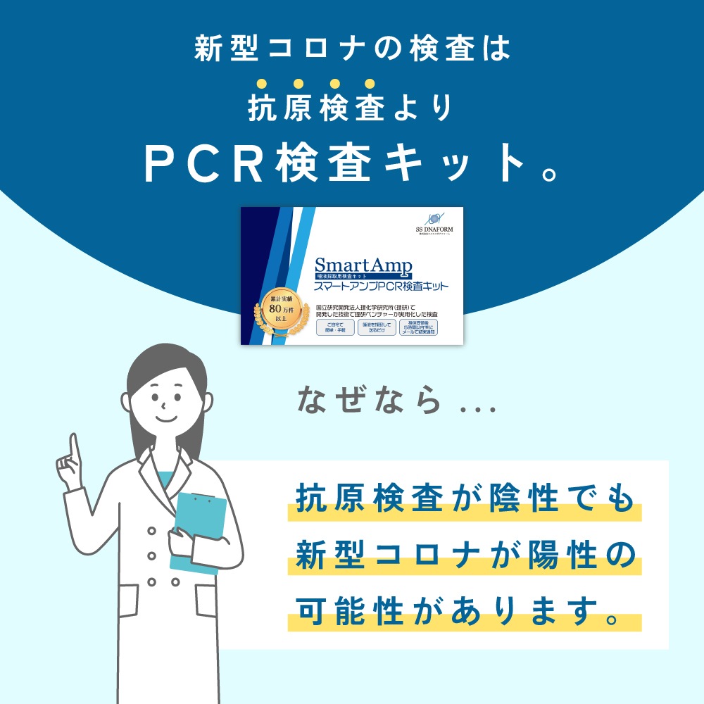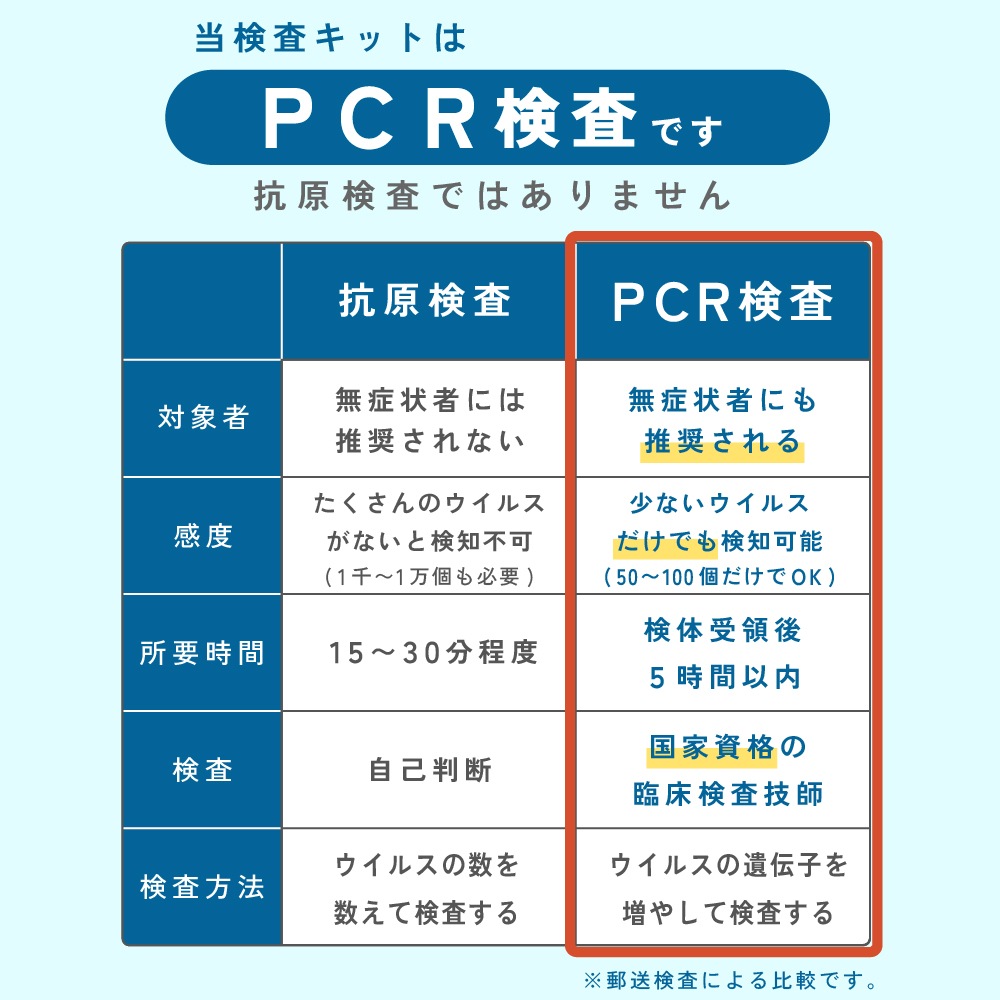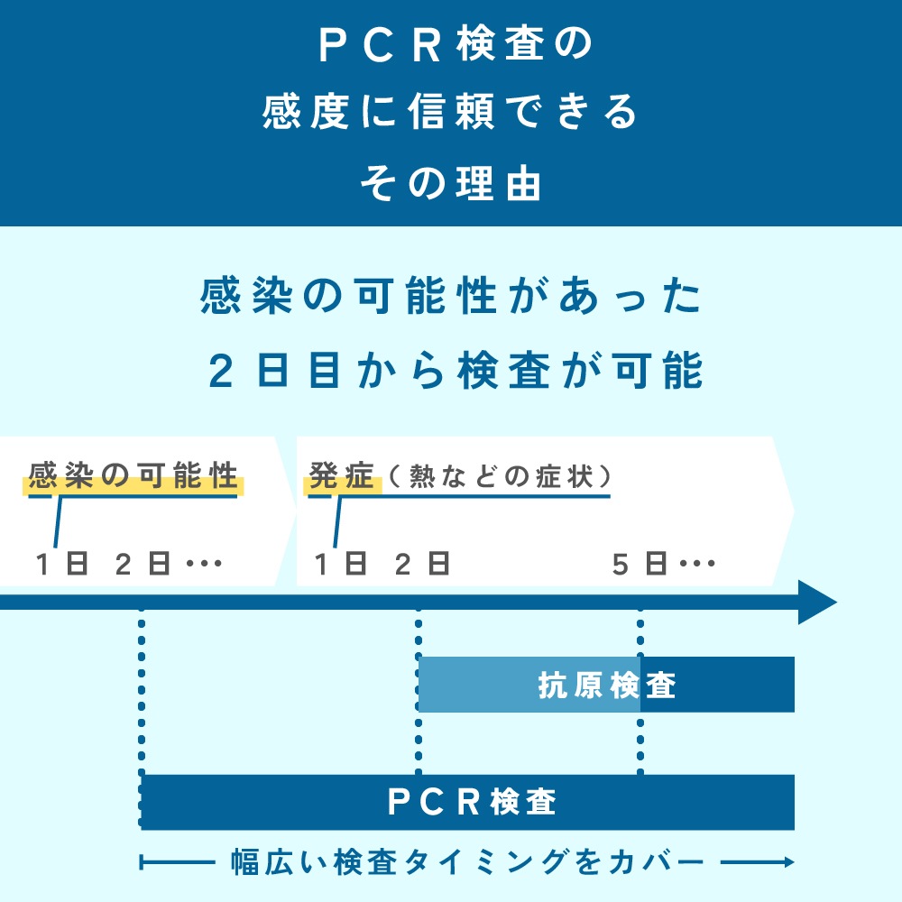 【抗原検査よりも高精度な判定】PCR検査は国の承認を得た臨床検査技師によるウイルスの遺伝子およびDNAを特殊な技術で増幅させ検出させる検査方法であるため、より高い検出率となっております。