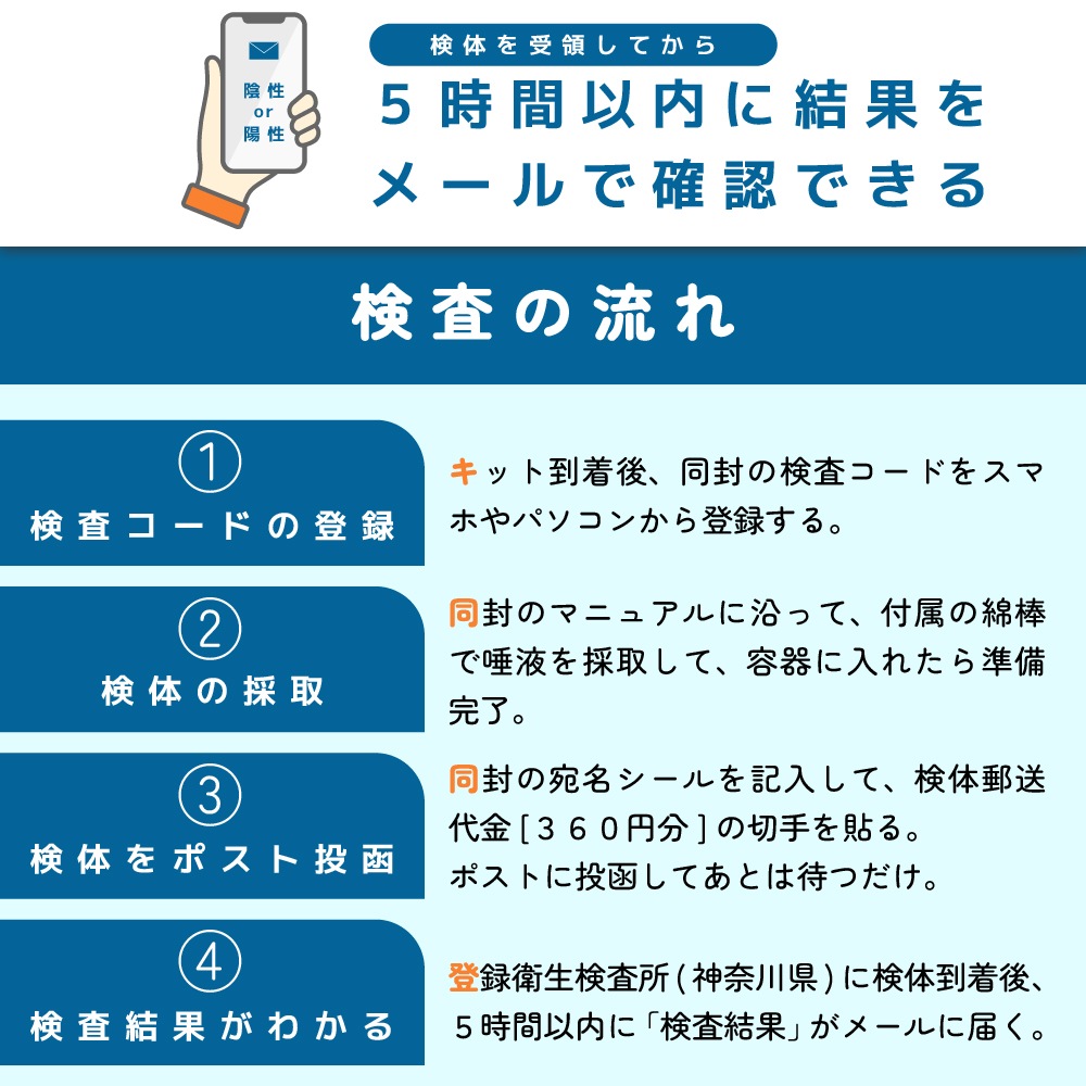 【唾液採取タイプ】付属の綿棒(スワブ)を30秒ほど口にくわえて、検査容器にセットして360円分の切手を貼りポストに投函後検査センターにて受領して5時間以内に結果がメールで受け取れます。