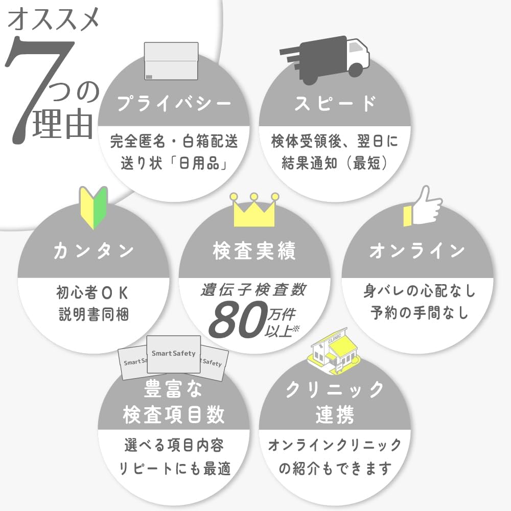 【内容|補足】 採取容器・検査キットご利用方法・検査申込書・返送用封筒|匿名性の高いパッケージでお届け。申し込みも匿名でOKです。研究用試薬を用いた検査であり診断には使えませんのでご注意ください。